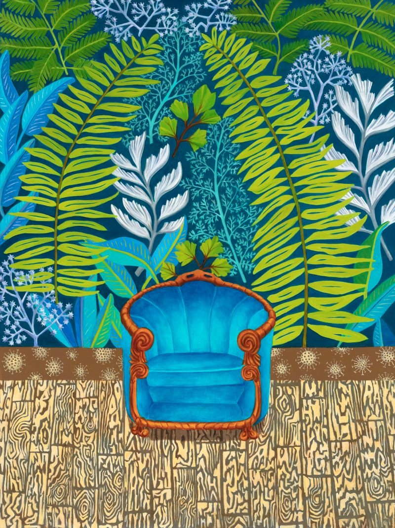 As lockdowns eased, the diaristic Covid Chair Series painted during isolation evolved into larger oil and acrylic paintings of interior settings resplendent with plants, exploding with lush, vibrant color, and intricate, contrasting patterns. These effervescent compositions, with their shifting, oscillating planes present familiar, yet idiosyncratic off-kilter worlds. Infused with a unique, magical vibrancy, their vivacity acts as a foil to the darkness and grief often present in our reality.