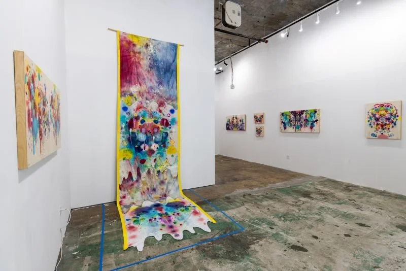 Inspired by early memories of the artist being administered Rorschach tests — a psychological evaluation of mental health and trauma through associative responses to inkblots — Tran transforms and transports the familiar monochromatic prints into a world of vibrant, technicolor panels that explore the nature of viewer subjectivity. Featuring work from her Mirror and Cosmic Circle series, Matriarchs and Daughters Dream Oceans of Braille is an explosion of colorful dots, circles, blot, and splashes that accumulate on the panel and create a thickened impasto.