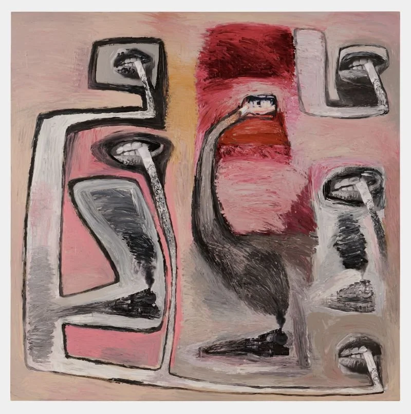 The concluding lines of the exhibition’s glib, sparse press release suggests Prince wants us to think of Philip Guston’s grubby pink smoking figures with his palette and the cigs. “All these doors connect because I locked myself in and I locked myself out.” This is reminiscent of a famous, possibly apocryphal story told to Guston by John Cage concerning baggage artists must clear their minds of: “When you start working, everybody is in your studio—the past, your friends, enemies, the art world, and above all, your own ideas—all are there. But as you continue painting, they start leaving, one by one, and you are left completely alone. Then, if you’re lucky, even you leave.” It goes without saying Prince is no Guston or Cage, either.