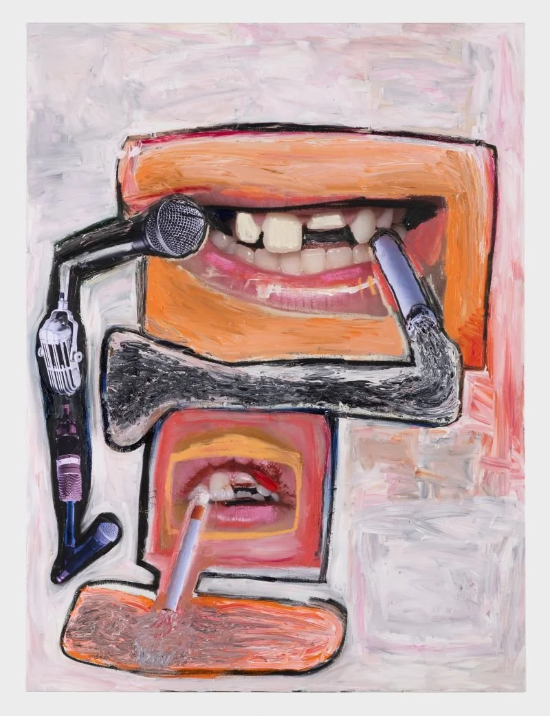 Folk Songs is image-hungry. It hoovers them up with reckless abandon in galleries lined with bricolaged canvases, all titled Untitled (Folk Songs). A slurry of microphones meets a barrage of missing tooth close ups, cigarettes, and shots of horrific stitched up wounds. It’s exceedingly teenage. Some have diagrammatic drawings of stereotypical hexagonal coffins. There are pictures of many of the sculptures also on view woven into the mess. Energetically slathered paint strokes that coat the edges of the printed collage elements turn them into funny exquisite corpse tableaux extending their parts into silly shapes.